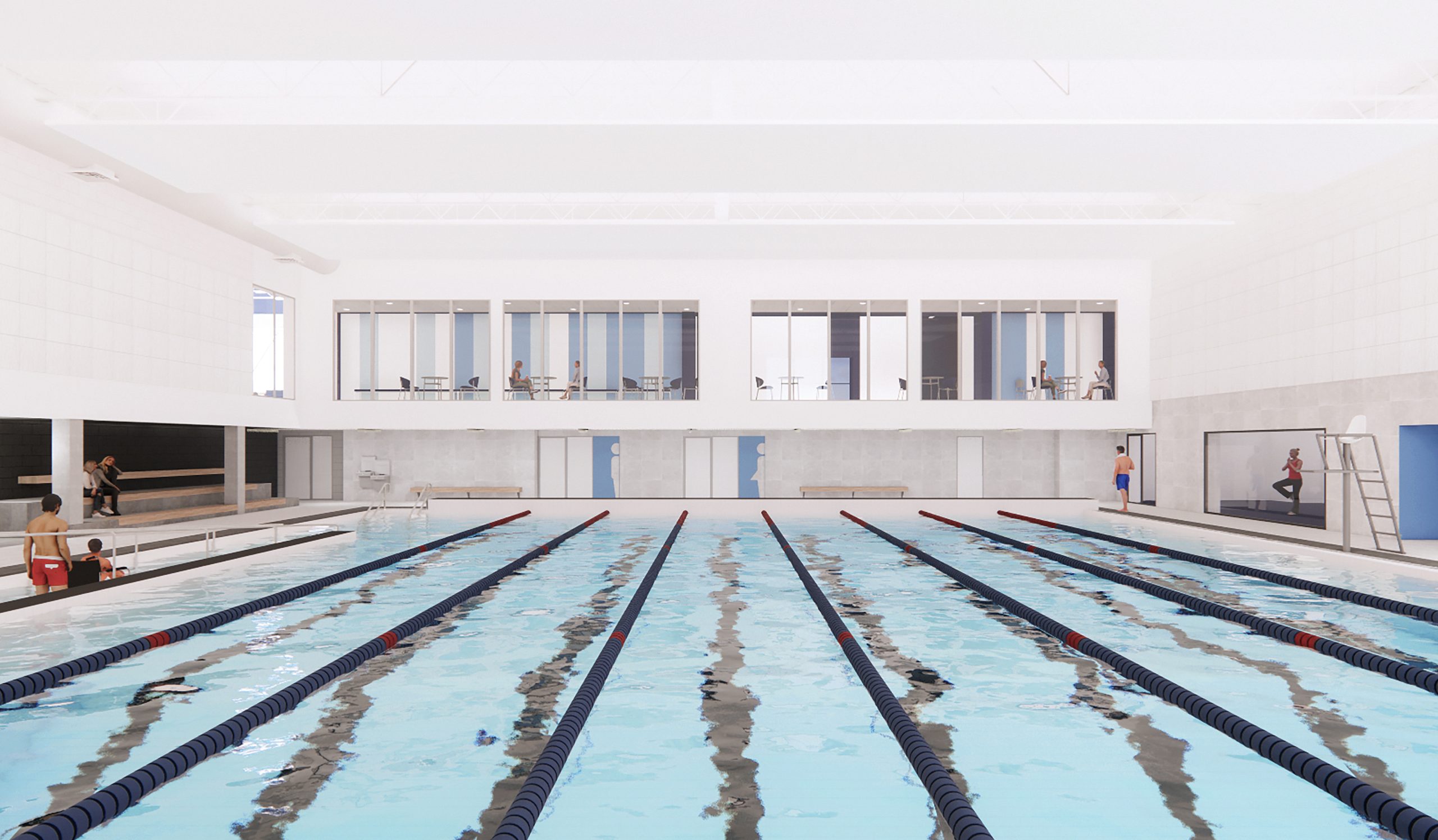 The project includes the reconstruction of the indoor pool, the integration of universally accessible and inclusive changing rooms, the complete transformation of the entrance hall, the modernisation of the existing multifunctional spaces, as well as building extension on the façade to add exercise rooms and an administrative area.